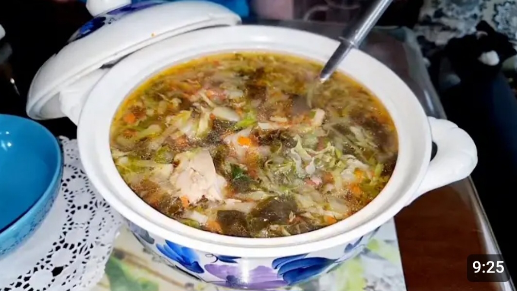 РЕЦЕПТ: Куриные бёдра без кости.500.г. Капуста молодая.1.шт.300.г. Лук.1.шт. Картофель.300.г. Лавровый лист.3.шт. Морковь.1.шт. Вода.3.л. Чеснок.2.зуб. Болгарский перец.1.шт. Петрушка замороженная.1.ст.л. Домашний томат.200.г. Подсолнечное масло.3.ст.л. Сметану подать к столу. ПРИЯТНОГО АППЕТИТА!🍒ПРОСТО И ВКУСНО!🍒