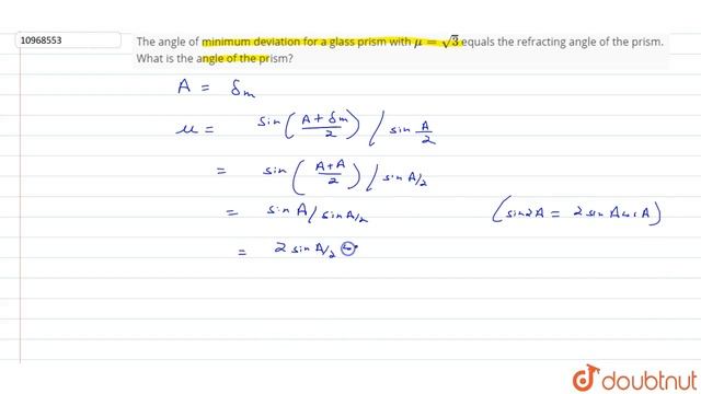The angle of minimum deviation for a glass prism with mu=sqrt3 equals the refracting angle of the prism. What is the angle of the prism? Class: 12 Subject: PHYSICS Chapter: REFRACTION OF LIGHT Board:IIT JEE You can ask any doubt from class 6-12, JEE, NEET, Teaching, SSC, Defense and Banking exam on Doubtnut App or You can Whatsapp us at - 8400400400 Link - https://doubtnut.app.link/2um0jr7Joeb Join our courses to improve your performance and Clear your concepts from basic for Class 6-12 School and Competitive exams (JEE/NEET) - https://doubtnut.app.link/POyZDvv5Lyb Contact Us: 👉 Have Any Query? Ask Us. 🤙 Call: 01247158250 💬 WhatsApp: 8400400400 📧 Email: info@doubtnut.com 🌐 Website: https://www.doubtnut.com Welcome to Doubtnut. Doubtnut is World’s Biggest Platform for Video Solutions of Physics, Chemistry, Maths and Biology Doubts with over 5 million+ Video Solutions. Doubtnut is a Q&A App for Maths, Physics, Chemistry and Biology (up to JEE Advanced and NEET Level), Where You Can Ask Unlimited Questions by Clicking a Picture of Doubt on the Doubtnut App and Get Instant Video Solution. Subscribe Our YouTube Channels: ✿ Doubtnut: https://www.youtube.com/channel/UCcv7pspGHmM7AOywuLM1ufA?sub_confirmation=1 ✿ Class 11-12, JEE & NEET (Hindi): https://www.youtube.com/channel/UCiIrZf4bn1i0IOf8YgSMzWA?sub_confirmation=1 ✿ Class 11-12, JEE & NEET (English):: https://www.youtube.com/channel/UCbJ_xe2bMLo9yuBC-i_13MQ?sub_confirmation=1 ✿ Class 6-10 (Hindi): https://www.youtube.com/channel/UCZnV1hkn5A3fdpTOVi60tzg?sub_confirmation=1 ✿ Class 6-10 (English): https://www.youtube.com/channel/UC9KeHSWOEBXIrbWYasHeSyg?sub_confirmation=1 ✿ Doubtnut Govt. Exams: https://www.youtube.com/channel/UCWPaROsU_06MSqiZ_O6zaVg?sub_confirmation=1 Follow Us: 🔔 Facebook: https://www.facebook.com/doubtnut 🔔 Instagram: https://www.instagram.com/doubtnut 🔔 Telegram: https://t.me/DoubtnutOfficial 🔔 Twitter: https://twitter.com/DoubtnutApp 🔔 LinkedIn: https://www.linkedin.com/company/doubtnut Our Telegram Pages: 🔔 Doubtnut Official: https://t.me/DoubtnutOfficial 🔔 Doubtnut IIT JEE: https://t.me/DoubtnutIITJEE 🔔 Doubtnut NEET: https://t.me/Doubtnut_NEET 🔔 Doubtnut CBSE Boards: https://t.me/DoubtnutCBSEBoards 🔔 Doubtnut UP Boards: https://t.me/DoubtnutUPBoards 🔔 Doubtnut Bihar Boards: https://t.me/DoubtnutBiharBoards 🔔 Doubtnut Government Exams: https://t.me/DoubtnutGovernmentExams class 12 class 12 physics class 12 chemistry class 12 english class 12 maths class 12 biology cbse class 12 result class 12 economics class 12 accountancy class 12 syllabus physics cbse class 12 class 12 english grammar class 12 syllabus cbse class 12 history class 12 geography class 12 ncert class 12 syllabus cbse class 12 maths cbse class 12 english cbse class 12 physics cbse class 12 chemistry class 12 grammar cbse class 12 biology cbse class 12 commerce cbse class 12 accountancy class 12 syllabus chemistry class 12 grammar syllabus class 12 syllabus maths class 12 latest syllabus class 12 syllabus english class 12 syllabus biology class 12 syllabus of physics class 12 syllabus of chemistry class 12 syllabus science class 12 syllabus ncert class 12 syllabus of english class 12 syllabus commerce
