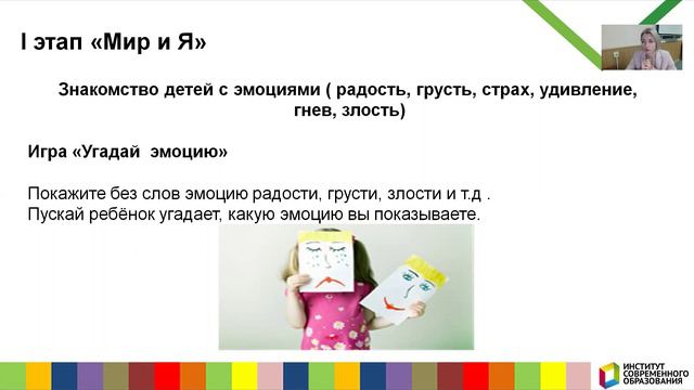 Эмоциональный интеллект - это способность человека распознавать эмоции, понимать намерения, мотивацию, желание других людей и свои собственные. Все эмоции важны и нужны для нравственного становления каждого человека, но объяснить это в нежном возрасте, когда ребёнок ещё только присматривается к миру, не зная его законов, - действительно, сложная задача. Развитие эмоционального интеллекта является важным фактором для полноценного развития ребенка, его адаптации к социальному миру и готовности к школьному обучению. Институт современного образования (ИСО) Об институте: Автономная некоммерческая организация дополнительного профессионального образования «Институт современного образования» Учредителем АНО ДПО «Институт современного образования» является АОНО ВО «Институт менеджмента, маркетинга и финансов» - это вуз, который более 30 лет занимается подготовкой востребованных кадров. 5 направлений деятельности АНО ДПО «Институт современного образования»: • Повышение квалификации, профессиональная переподготовка и профессиональное обучение для работников сферы образования. • Повышение квалификации и профессиональная переподготовка в сфере менеджмента, управления персоналом, бухгалтерского учёта, контрактных закупок, охраны труда, обеспечения безопасности, сервиса и оказания услуг населению и ещё более 30 направлений. • Курсы английского языка и программирования для взрослых и детей. • Корпоративные курсы и тренинги по направлениям подготовки. • Индивидуальные учебные программы под потребности организаций или обучающегося. Ключевые преимущества для наших слушателей: • Гарантия качества знаний • Удобно • Финансово выгодно Если вы хотите сменить профессию или расти и развиваться в своей — переходите на наш сайт https://isoedu.ru/, выбирайте образовательную программу и записывайтесь на обучение. Наша задача – чтобы каждый желающий получил качественное образование по приемлемым ценам. Контакты: Сайт: www.isoedu.ru ВК: https://vk.com/isoedu E-mail: dpo@doiso.ru, info@isoedu.ru По вопросам обучения (сроки обучения, проверка работ, выдача документов) обращайтесь по телефонам: +7 (910) 240-21-37, (910) 732-86-78.