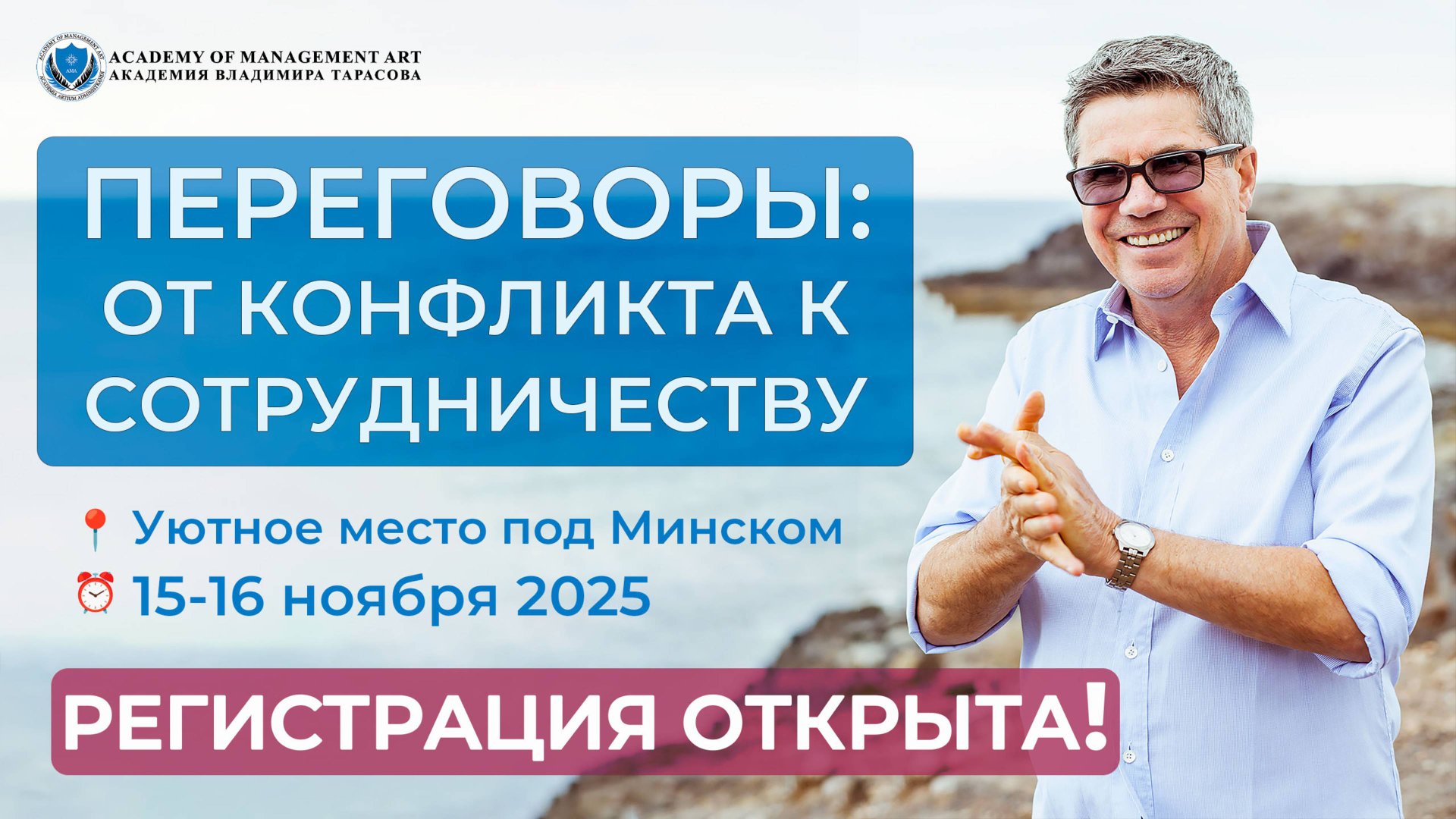 Что делать, если переговоры зашли в тупик? Мастер-класс Владимира Тарасова даст ответ и практические приёмы. Приглашаем Вас на новый очный мастер-класс Владимира Тарасова «Переговоры: от конфликта к сотрудничеству» 📅 15–16 ноября 2025 📍 Уютное место под Минском За два дня вместе с Владимиром Тарасовым Вы разберётесь: 🔹Как возникают и развиваются конфликты 🔹Методы выхода из тупиковых ситуаций 🔹Приёмы перевода конфликта в сотрудничество или даже дружбу 🔹Личный опыт и реальные кейсы от спикера Это эксклюзивная встреча для предпринимателей и управленцев, где Вас ждёт: ✔️ Новый подход к переговорам и управленческой борьбе ✔️ Практика влияния в стрессовых ситуациях ✔️ Личное общение с Владимиром Тарасовым ✔️ Камерная интеллектуальная атмосфера 💰 Стоимость участия — от 2500€ (включая проживание, питание и приветственный ужин). Количество мест ограничено! Последние 10 будут проданы с аукциона. 📲 Регистрация и оплата: +37258903555 ✉️ Подробнее: https://ama1984.com/seminar202511?source=yt250812v #ВладимирТарасов #академия1984 #переговоры #управленческоемышление #мастеркласс #Минск #конфликты #лидерство #социальныетехнологии #управленческаябoрьба #искусствопереговоров #тренингдляруководителей #бизнеспереговоры #лидерство2025