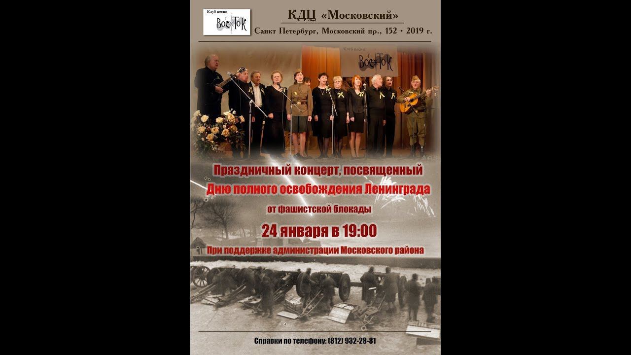 Концерт, посвящённый 75-летию полного снятия блокады Ленинграда. Клуб песни "Восток". Санкт-Петербург, Московский пр., 152. Концертно-досуговый центр "Московский", большой зал. 24 января 2019 г. Ведущая – Елена Гудкова. Запись видео – Алла Левитан. обработка звука – Алексей Холмецкий. 1. Вячеслав Ковалёв. Вечерняя песня (В. Соловьев-Седой – А. Чуркин) 2. Наталия Гудкова-Сарпова и Светлана Ветрова. Примета (Б. Окуджава) 3. Михаил Семененко. Рябиновый вальс (Б. Алмазов) 4. Варвара Гарнюк. Блокадный вальс (М.Трегер) 5. Валентин Вихорев. «Я пацан из Ленинграда…» (стихи В. Вихорева) и Воспоминания об отце (В. Вихорев) (аккомпанирует Сергей Ильин). 6. Мария и Геннадий Демины. Матушка пела (М. Трошин – К. Скворцов) 7. Тамара Фирсова и Борис Тарасов. Холода (А. Васин – В. Павлинов) 8. Борис Тарасов. Ленинградская песня (И. Растеряев) 9. Светлана Широва и Юлиан Афанасьев. Ладога (Л. Шенберг и П. Краубнер – П. Богданов) 10. Иван Григорьев. Ленинградские мальчишки (И. Шварц – В. Коростылёв) 11. Владимир Шемшученко. Вратарь (А. Лемыш – О. Дмитриев) 12. Михаил Семененко. Сердце (И. Дунаевский – В. Лебедев-Кумач) 13. Александр Тимофеев. Я смутно, но помню... (А. Тимофеев) 14. Александр Тимофеев. Язычник (А. Тимофеев) 15. Вячеслав Ковалёв. Волховская застольная (И. Любан – П. Шубин) 16. Светлана Широва и Юлиан Афанасьев. Ленинградская песенка (А. Лепин – П. Шубин) 17. Тамара Фирсова. В сельском клубе (В. Берковский – Р. Ольшевский) 18. Наталия Гудкова-Сарпова и Светлана Ветрова. По Фонтанке (А. Тальковский – Б.Окуджава) 19. Татьяна Кутепова. День снятия Блокады (Т. Кутепова) 20. Мария и Геннадий Демины. Блокадная (А. Нежевец – А. Городницкий) 21. Сергей Ильин. На площади у Смольного (Т. Гальперин) 22. Все участники. Атланты (А. Городницкий) Стихи: О. Берггольц, В. Вихорева, В. Вольтман-Спасской Отрывки из воспоминаний: И. Глазунова, О. Берггольц, П. Губчевского, Е. Новожениной Отрывки из «Блокадной книги» Алеся Адамовича, Даниила Гранина.