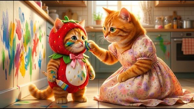 Мама-кошка помогает котенку превратить беспорядок с красками в искусство!