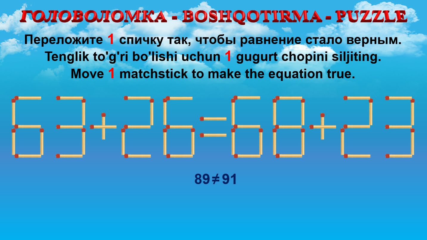 ГОЛОВОЛОМКА - BOSHQOTIRMA – PUZZLE. Спичка. 63+26=68+23, 64+28=62+29, 68+25=60+32, 69+28=62+32