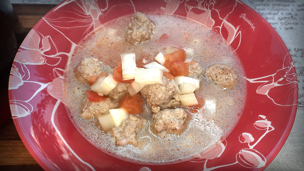 Суп с фрикадельками, кабачками и помидорами / Вкусно и сытно.