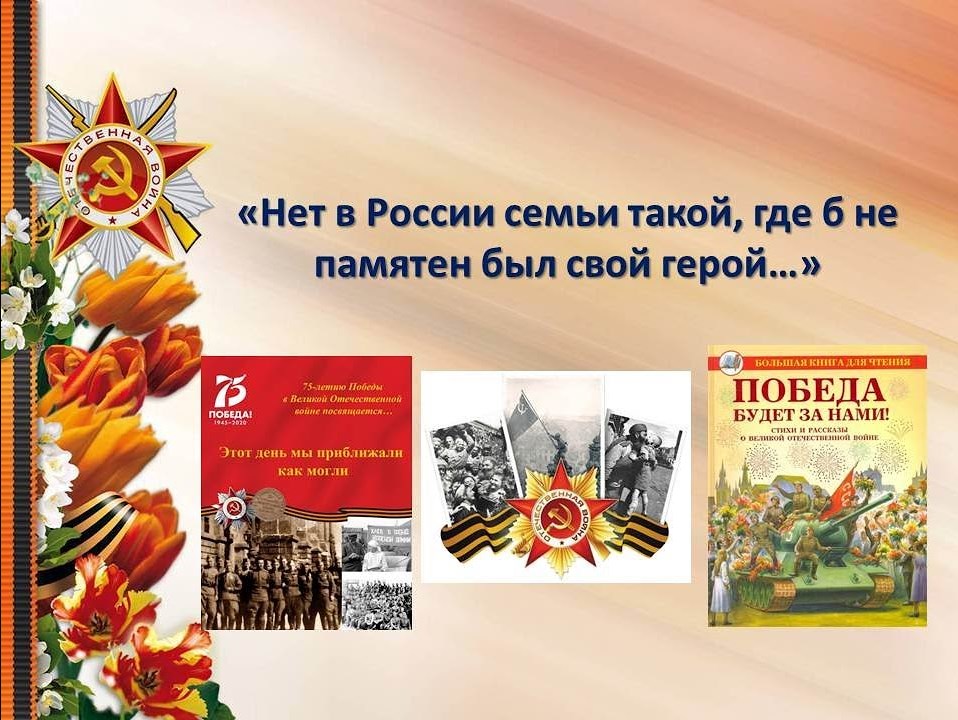Библиотека-филиал № 19 представляет видеопрезентацию «Нет в России семьи такой, где б не памятен был свой герой…» (книги и фильмы о Великой Отечественной войне).