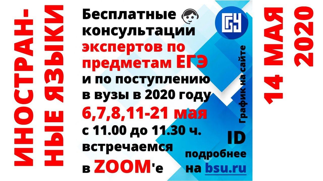 Уважаемые выпускники, их родители и классные руководители! С 6 по 21 мая пройдут бесплатные онлайн-консультации для учеников старших классов по всей России. 11 ведущих экспертов ЕГЭ проведут для вас консультации по всем общеобразовательным предметам, расскажут, как избежать ошибок и не потерять баллы. Ответственный секретарь Приемной комиссии БГУ даст подробную инструкцию, как будет проходить Приемная кампания-2020: что ждет абитуриентов, как в этом году подавать документы, какие существуют льготы, что такое конкурс, в какие даты будет проходить зачисление и многое другое. Консультации будут проходить на платформе ZOOM, присоединиться можно по ссылке https://us02web.zoom.us/j/9976663333 через ПК, планшет или телефон. Также будет вестись прямая трансляция с записью на канале "LifeBsu" в ютубе. Идентификатор конференции 997 666 3333 без пароля Начало консультаций в 11.00 согласно представленному графику. График онлайн-консультаций с экспертами по предметам ЕГЭ и по поступлению в вузы в 2020 году в новости по ссылке http://www.bsu.ru/news/22973/