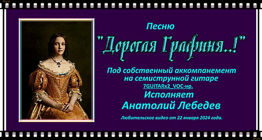Анатолий Лебедев из Питера. ЛЮБИТЕЛЬСКОЕ ВИДЕО Анатолия Лебедева с его исполнением новой печни 2024 года "ДОРОГАЯ КНЯГИНЯ"под собственный аккомпанемент на семиструнной гитаре. Слова - ВЯЧЕСЛАВА КРАСНОВА. Музыка - ТАТЬЯНЫ ЛЕБЕДИНСКОЙ (Мелодия песни 2ГРАФИНЯ") Исполняет - Анатолий Лебедев. Видеозапись исполнения песни, работа со звуком и монтаж видеоролика сделаны А. Лебедевым 22 января 2024 года.