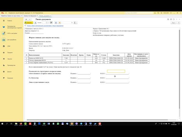 Заказ материалов поставщику по спецификации