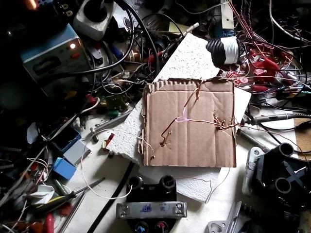 "Конденсатор потока". Высоковольтный разряд в форме буквы V. Используются две катушки зажигания и коммутатор зажигания от ВАЗа. Вместо датчика Холла - компьютерный вентилятор с 3-мя проводами. С одного источника высокого напряжения не получится добиться искры такой формы.