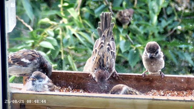 Воробьи в кормушке летом - завтрак