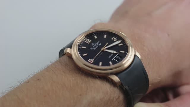 *видео переведено в Яндекс браузере Часы Blancpain Léman Grande Date Aqua Lung имеет 40 мм корпус из 18-каратного розового золота, ступенчатую рамку и устойчивое к царапинам сапфировое стекло. Черный циферблат имеет нанесенные часовые индексы в розовый тон со светящимися заливками, напечатанные белые минутные отметки, большая дата «двойная диафрагма» в положении 6-ти часов и розовые центральные стрелки со светящимися заливками. Механизм этих Leman Grande Date Aqua Lung, видимый через сапфировый корпус, питается автоподводом Blancpain cal. 6950, который может похвастаться 72-часовым запасом хода. Часы представлены на черном ремешке из телячьей кожи с пряжкой из 18-каратного розового золота. *цены от 12.000 до 17.000$ на вторичном рынке.