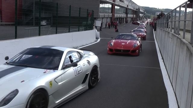 A Bunch of Ferrari 599 XX and 2 Ferrari FXX starting up from the pits to race each other at the "Corse Clienti" in Spa Francorchamps!