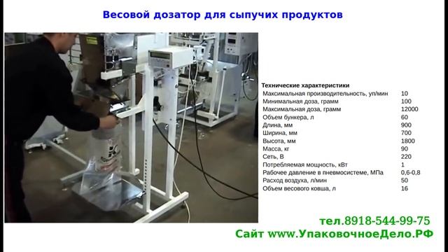 Подробности и цена на сайте https://upakovochnoedelo.ru/ Предприятие "УпаковочноеДело" тел. 8-918-544-99-75, тел. 8-951-839-71-89 предлагает самое современное оборудование на выгодных для Вас условиях: - фасовочно-упаковочное оборудование (автоматы, полуавтоматы, дозаторы) для фасовки и упаковки сыпучих, пылящих и штучных продуктов (семечки, орехи, фисташки, чипсы, крупы, сахар, конфеты, пряники, пельмени, мука, кофе, какао, чай, порошки, специи, сухофрукты, соль, сухари, корма и др.), - а также мы предлагаем дозаторы для жидких и пастообразных продуктов; - Термоусадочные машины- оборудование для групповой упаковки в термоусадочную пленку; - Вакуумные упаковщики для вакуумной упаковки мыса,рыбы,овощей,колбасы в вакуумные пакеты; - Запайщики пакетов, ручные, напольные, ножные, конвейерные роликовые; - Датеры, мешкозашивочные машинки и др. виды оборудования. Наше предприятие предоставляет полный спектр услуг: поставка оборудования, сборка, подключение, пуско-наладка, обучение, гарантийное и послегарантийное обслуживание. С уважением и надеждой на сотрудничество, Предприятие "Упаковочное дело" тел. 8-918-544-99-75 тел. 8-951-839-71-89 pakdelo@bk.ru info@upakovochnoedelo.ru stanokpak@yandex.ru Сайт http://www.УпаковочноеДело.рф https://upakovochnoedelo.ru/ http://upakovochnoedelo.ru/ Все наши видео обзоры на Канале YouTube https://www.youtube.com/@upakovochnoedelo/ Телеграм канал https://t.me/s/pakdelo ВКонтакте https://vk.com/pakdelo Дзен https://dzen.ru/pakdelo Одноклассники https://ok.ru/group/62457082937541 Все видео RuTube https://rutube.ru/channel/25129081/videos Дозатор предназначен для весового дозирования сыпучих продуктов с высокой степенью точности. Дозирование производится в готовые пакеты, коробки, и прочую тару. Дозатор имеет пневмопривод на ковш, которому требуется подача сжатого воздуха. Рабочий диапазон весов от 0.1 до 12 кг. Дозирующее оборудование дает возможность упаковывать такие продукты как крупы, короткорезанные макаронные изделия, орехи, семечки, сахар и т.д. С электронного блока задаются параметры для работы дозатора, на дисплее высвечивается текущее значение веса. Набранная доза сбрасывается по воронке в подставленную тару. На дозаторе установлен регулируемый по высоте столик. Возможна комплектация сменными воронками и загрузочной системой. Технические характеристики Максимальная производительность, уп/мин 10 Минимальная доза, грамм 100 Максимальная доза, грамм 12000 Объем бункера, л 60 Длина, мм 900 Ширина, мм 700 Высота, мм 1800 Масса, кг 90 Сеть, В 220 Потребляемая мощность, кВт 1 Рабочее давление в пневмосистеме, МПа 0,6-0,8 Расход воздуха, л/мин 50 Объем весового ковша, л 16 #дозатор #фасовка #фасовочноеоборудование #фасовщик #дозирующееоборудование #промышленноеоборудование #фасовочноеоборудование #фасовкасыпучихматериалов