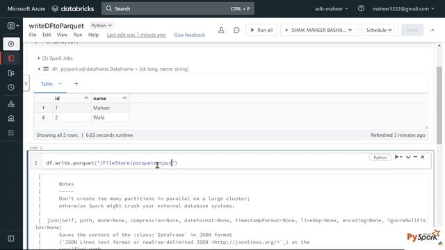 In this video, I discussed about writing dataframe data into parquet file using pyspark. Link for PySpark Playlist: https://www.youtube.com/watch?v=6MaZoOgJa84&list=PLMWaZteqtEaJFiJ2FyIKK0YEuXwQ9YIS_&index=1 Link for PySpark Real Time Scenarios Playlist: https://www.youtube.com/watch?v=fa4oQu--tHg&list=PLMWaZteqtEaKPPXYSJcbJSvSumBzuKByd&index=1 Link for Azure Synapse Analytics Playlist: https://www.youtube.com/watch?v=Qoatg-SPpe4&list=PLMWaZteqtEaIZxPCw_0AO1GsqESq3hZc6 Link to Azure Synapse Real Time scenarios Playlist: https://www.youtube.com/playlist?list=PLMWaZteqtEaKxRIiTtO7kSKpGVZq2H9uO Link for Azure Data bricks Play list: https://www.youtube.com/watch?v=bO7Xad1gOFQ&list=PLMWaZteqtEaKi4WAePWtCSQCfQpvBT2U1 Link for Azure Functions Play list: https://www.youtube.com/watch?v=eS5GJkI69Qg&list=PLMWaZteqtEaLRsSynAsaS_aLzDPBUU4CV Link for Azure Basics Play list: https://www.youtube.com/watch?v=76RqLfkypUg&list=PLMWaZteqtEaISLvsOPuAq4Ya2eNYeWypv Link for Azure Data factory Play list: https://www.youtube.com/watch?v=Mc9JAra8WZU&list=PLMWaZteqtEaLTJffbbBzVOv9C0otal1FO Link for Azure Data Factory Real time Scenarios https://www.youtube.com/watch?v=WR6AbQ3grMU&list=PLMWaZteqtEaLacN3eS3s8pw2jtwBVb1BH Link for Azure Logic Apps playlist https://www.youtube.com/watch?v=KxkiE2JC0RU&list=PLMWaZteqtEaIWwpz64BwOBytNDPka700J #PySpark #Spark #databricks #azuresynapse #synapse #notebook #azuredatabricks #PySparkcode #dataframe #WafaStudies #maheer