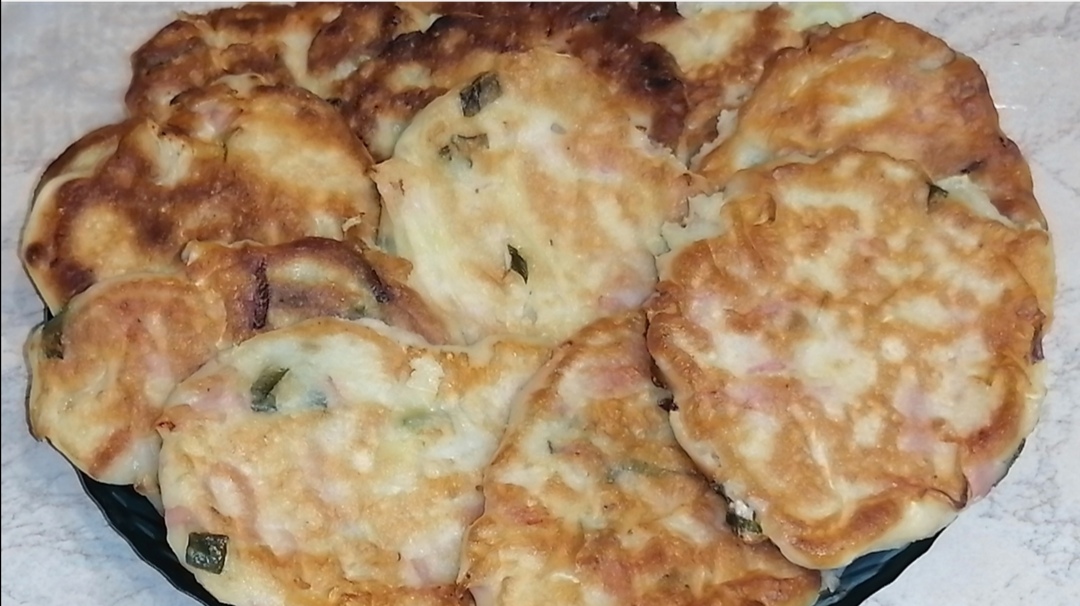 Оладьи на кефире с молодой капустой и ветчиной