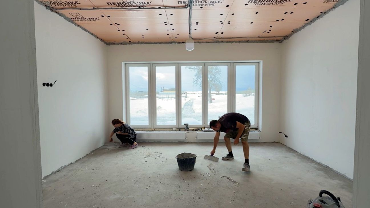 Начали укладывать плитку в спальне. Делаем ремонт в доме своими руками. Строим дом в деревне.