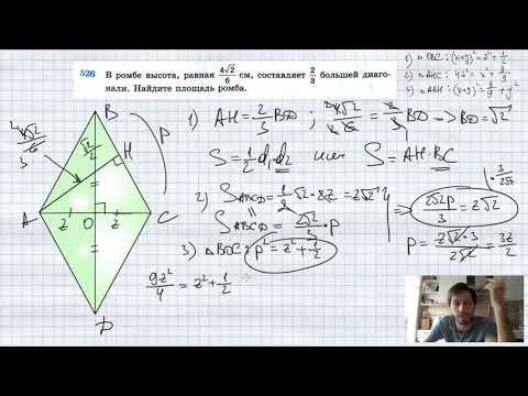 №526. В ромбе высота, равная см, составляет большей диагонали. Найдите площадь ромба. Мой второй канал для подготовки к ЕГЭ и ОГЭ - https://www.youtube.com/ЕвгенийСумин TikTok - https://vm.tiktok.com/WJJwK9 Like - https://likee.com/user/@ge0metriya Инстаграм - https://www.instagram.com/EGE_OGE.math Личный инстаграм - https://www.instagram.com/ee_sumin VK - https://vk.com/evgeniysumin FB - https://www.facebook.com/EvgeniySumin