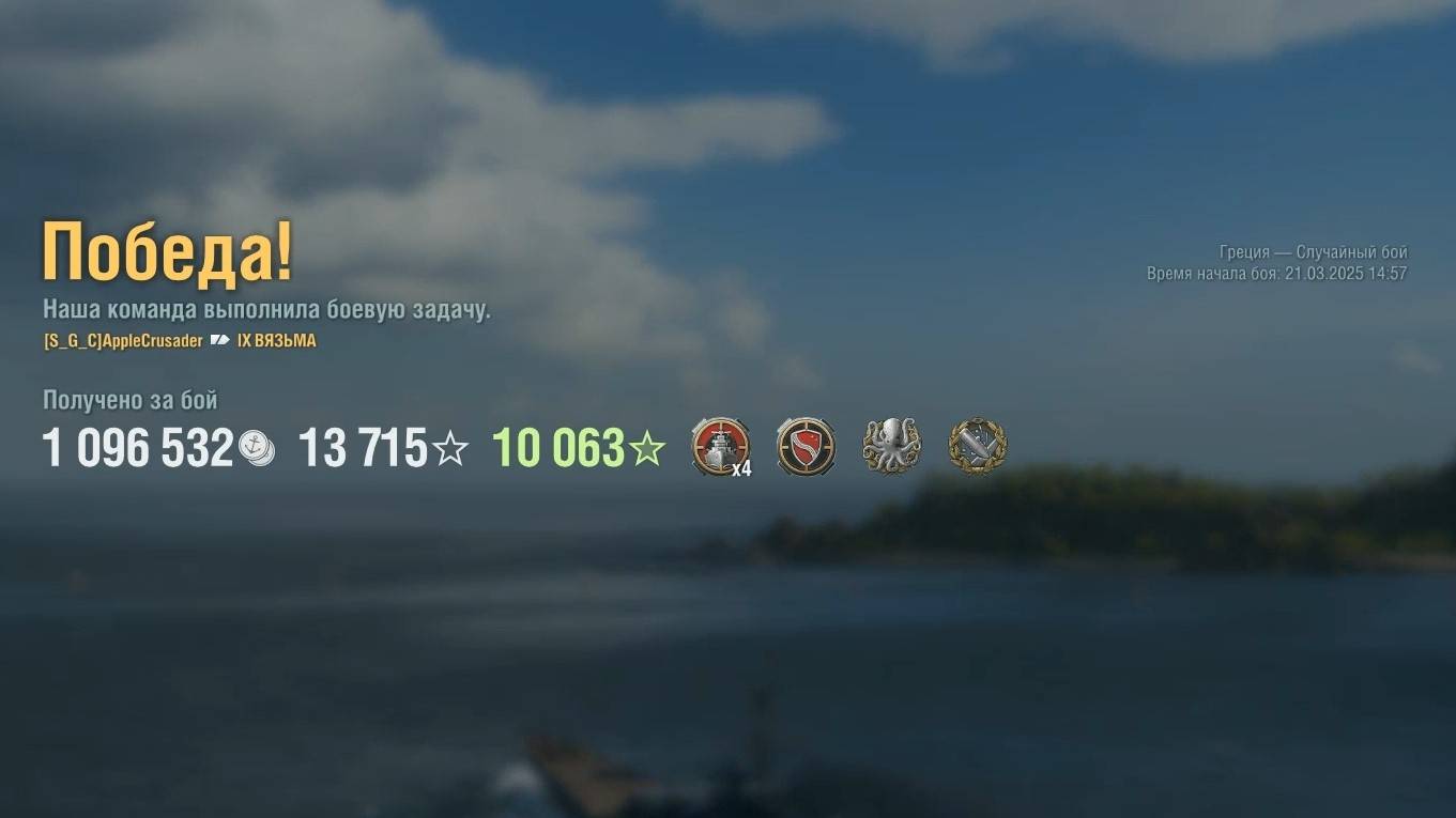 Крейсер Vyazma. Игрок: AppleCrusader (EU). Карта: Греция - Случайный бой. Урон: 183к. Vyazma - Крейсер СССР 9 уровня.