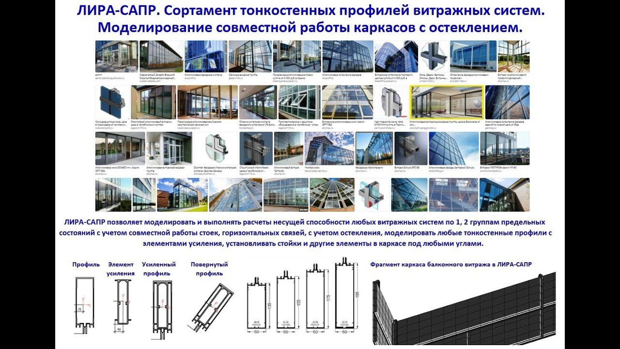 ЛИРА-САПР. Сортамент тонкостенных профилей витражных систем. Совместная работа каркаса с остеклением