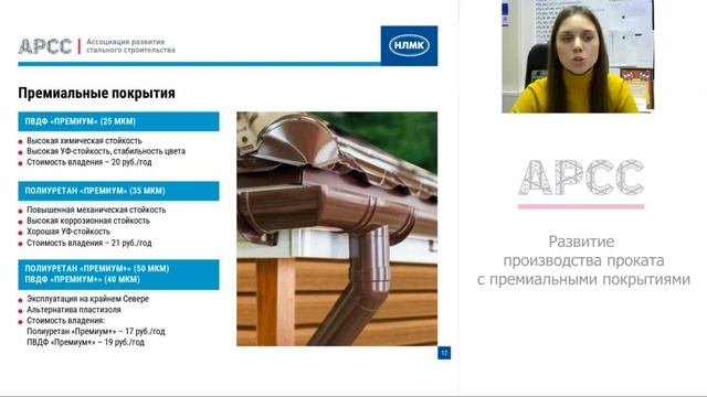 Докладчик Анна Волкова, инженер Управления развития технологии ПАО «НЛМК». План вебинара: 1. Общий обзор и краткая характеристика проката с полимерным покрытием; 2. Сравнительная характеристика стандартных и премиальных видов продукции; 3. Оценка долговечности проката с полимерным покрытием: натурные и ускоренные испытания. Скачать презентацию https://yadi.sk/i/N2-oEsLX2BTnkQ