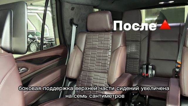 Тюнинг Ателье Vinyl Style в Казани https://vinylkazan.ru/vosstanovlenie-i-pereshiv-salona/ Изменение анатомии сидений заднего ряда Cadillac Escalade. Наш клиент — руководитель, которому часто приходится ездить сзади. Но стандартные задние сиденья не имели нужной анатомической формы — сидеть долго было неудобно. Покупать новые кресла? Слишком дорого. Поэтому мы решили изменить их анатомию. Нарастили боковую поддержку, ориентируясь на сиденья переднего ряда — теперь задние кресла не уступают по комфорту водительскому месту. Боковая поддержка верхней части сидений увеличена на 7 см, заменили по три элемента для идеальной формы под спину. Нижняя часть — плюс 4 см, заменили по одному кожаному элементу с наружней стороны. И всё это с ощутимым объёмом и плотностью.