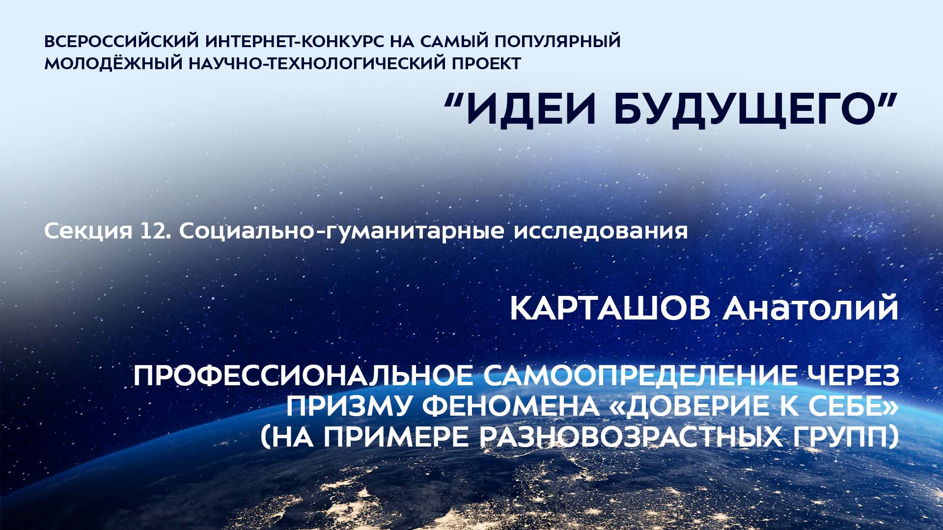 (12-7) КАРТАШОВ Анатолий Васильевич Мурманская область, г. Мурманск филиал Нахимовского военно-морского училища в г. Мурманске, 9 класс ПРОФЕССИОНАЛЬНОЕ САМООПРЕДЕЛЕНИЕ ЧЕРЕЗ ПРИЗМУ ФЕНОМЕНА «ДОВЕРИЕ К СЕБЕ» (НА ПРИМЕРЕ РАЗНОВОЗРАСТНЫХ ГРУПП) Научные руководители: Самойлова Юлия Валентиновна, Мурманская область, г. Мурманск, филиал НВМУ в г. Мурманске, преподаватель од (иностранный язык), Рыбакова Ирина Николаевна, Мурманская область, г. Мурманск, филиал НВМУ в г. Мурманске, преподаватель ОД (иностранный язык) Более подробно о мероприятиях Программы "Шаг в будущее" можно узнать на сайтах http://www.step-into-the-future.ru/ и http://шагвбудущее.рф Мероприятия проводятся при поддержке Фонда президентских грантов