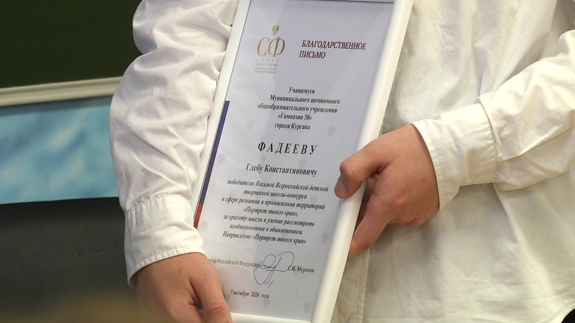 Ученик 30-й курганской гимназии Глеб Фадеев написал лучший портрет своего родного края в виде очерка. С победой во всероссийском конкурсе юношу поздравил сенатор Сергей Муратов.