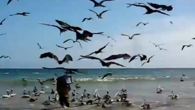 Птицы пытаются украсть добычу рыбака
