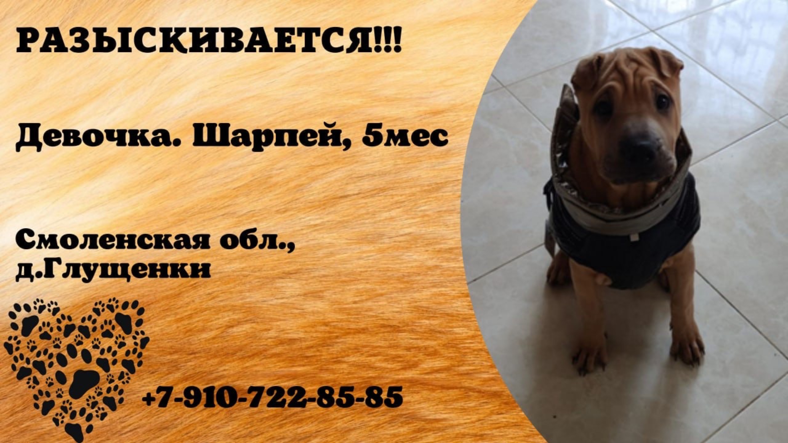 Смоленская Глущенки Пропала собака Пропала собака, порода шарпей, девочка 5 мес. Ночью с 31 декабря на 1 января около часа ночи в районе деревни Глущенки. Нашедшему просьба вернуть🙏🙏🙏Вознаграждение гарантирую. +79107228585 звонить в любое время Инфо: https://vk.com/wall-198815410_168042 Автор: https://vk.com/id64508837 #пропала_собака#смоленская#глущенки