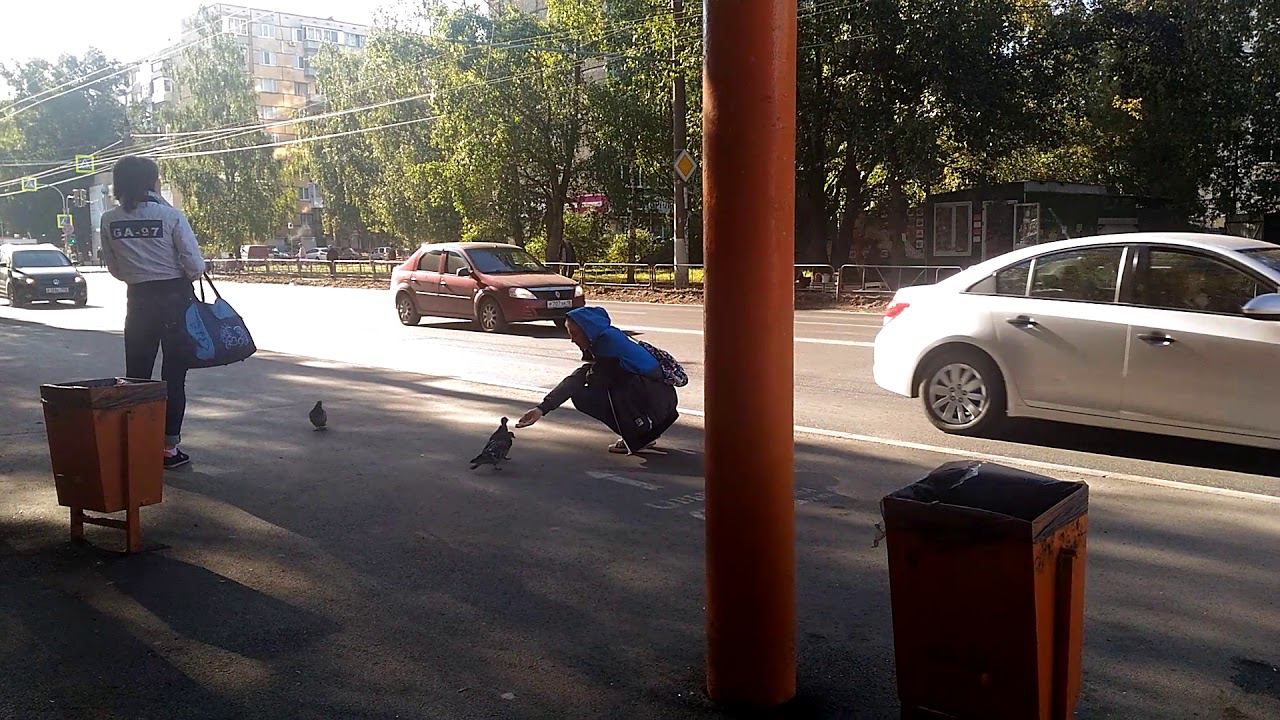 Парень кормит голубая с рук на остановке