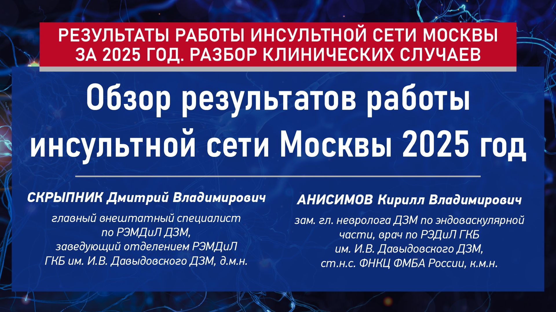 Результаты работы Инсультной сети Москвы за 2025 год. Разбор клинических случаев Обзор результатов работы инсультной сети Москвы 2025 год Анисимов Кирилл Владимирович зам. гл. невролога ДЗМ по эндоваскулярной части, врач по РЭДиЛ ГКБ им. И.В. Давыдовского ДЗМ, ст.н.с. ФНКЦ ФМБА России, к.м.н. Скрыпник Дмитрий Владимирович главный внештатный специалист по РЭМДиЛ ДЗМ, заведующий отделением РЭМДиЛ ГКБ им. И.В. Давыдовского ДЗМ, д.м.н.