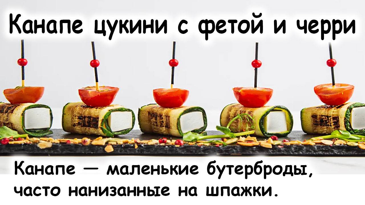Шеф-Россия.рф скачать: книги, меню, ттк, рецепты, школа, мастер классы. Очень удобная закуска для фуршетов – канапе – мини-закуски, состоящие из самых разнообразных ингредиентов, насаженных на шпажки. История блюда берёт начало ещё в XVII столетии во Франции, где придумали правило: при сервировке стола основным блюдам должны были предшествовать мини-бутерброды, задача которых пробудить аппетит. Само слово «canapé» с французского переводится как «крошечный, миниатюрный». Вариантов канапе великое множество, но все их можно разделить на два типа: у одних основой является подсушенный или поджаренный хлеб, а у других – какой-либо овощ. И сегодня мы приготовим с вами овощные канапе из кабачка с сыром фета и вялеными помидорами. Подготовить ингредиенты и шпажки. Кабачок вымыть, удалить плодоножку, нарезать тонкими пластинами вдоль толщиной около 3-5 мм, присолить во вкусу. Чеснок очистить и мелко нарезать, вяленые помидоры мелко порубить. Разогреть сковороду (лучше гриль) и обжарить ломтики кабачка на оливковом масле на сильном огне по 30 секунд с каждой стороны, выложить на бумажное полотенце для удаления лишнего масла. Добавить нарезанные томаты и чеснок к сыру фета, размять всё вилкой, перемешать. Собрать канапе: для этого на край каждого ломтика обжаренного кабачка выложить по 1 чайной ложке начинки, свернуть рулетом и закрепить шпажках #шефроссиярф #шефрф