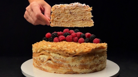 Хрустящие коржи, нежнейший ванильный пудинг, взбитые сливки и немного терпения — и вот вам один из самых вкусных тортов в мире! Сегодня я покажу вам шаг за шагом, как испечь настоящий домашний торт «Наполеон», от которого вы просто не сможете оторваться. Ингредиенты: Для тортов: 80 г яиц (примерно 1,5–2 шт.) 60 мл холодной воды 8 г яблочного уксуса 5 г соли 350 г муки 200 г сливочного масла Для крема: 6 яиц 300 г сахара 1 щепотка соли 50 г кукурузного крахмала 600 мл молока 70 г сливочного масла Дополнительно: 300 мл холодных сливок (33%) 1-2 кусочка посыпки Белый шоколад и свежие ягоды – для украшения Торт многослойный, нежный и по-настоящему праздничный. Каждая ложка представляет собой сочетание воздушного крема и хрустящих слоев, которые за ночь в холодильнике превращаются в гармоничное, тающее во рту совершенство. Этот «Наполеон» на вкус как из лучших кондитерских, только приготовленный с любовью на вашей собственной кухне.