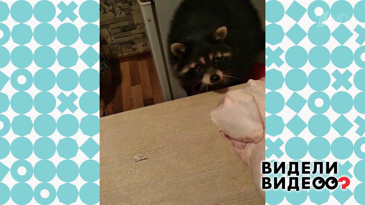 Енот, избегающий встречи с сырой курицей. Видели видео? Фрагмент выпуска от 10.11.2019