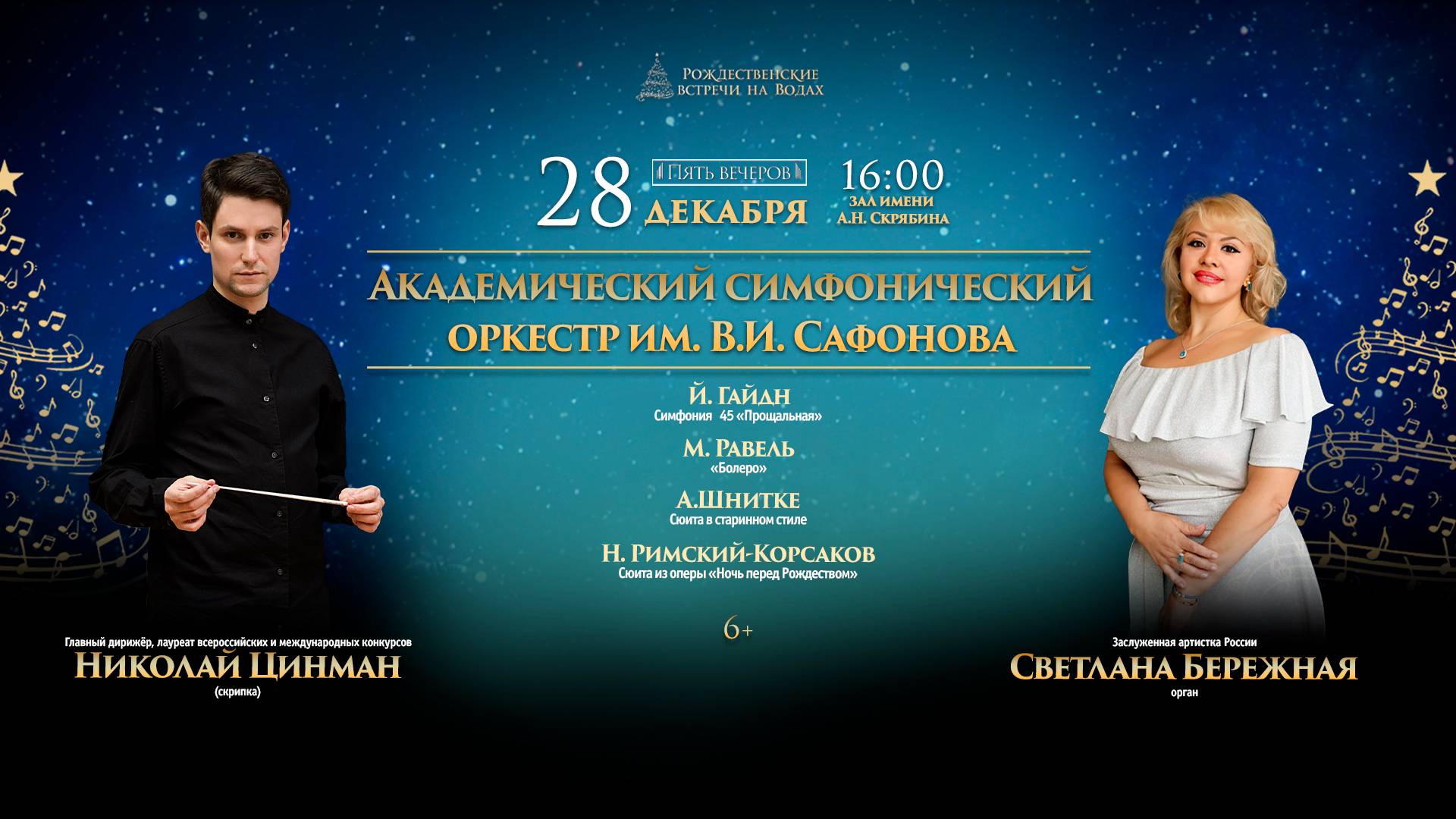 Фестиваль «Рождественские встречи на Водах» Академический симфонический оркестр им. В.И.Сафонова Й. Гайдн, Симфония № 45 «Прощальная» фа-диез минор М. Равель, «Болеро» Н. Римский-Корсаков, Сюита из оперы «Ночь перед Рождеством» А. Шнитке, «Сюита в старинном стиле» Заслуженная артистка России Светлана Бережная (орган) Главный дирижер оркестра, лауреат всероссийских и международных конкурсов Николай Цинман (скрипка) Festival «Christmas Meetings on the Waters» Academic Symphony Orchestra named after V. I. Safonov J. Haydn, Symphony No. 45 «Farewell» in F-sharp minor M. Ravel, «Bolero» N. Rimsky-Korsakov, Suite from the opera «The Night Before Christmas» A. Schnittke, «Suite in the Old Style» Honored Artist of Russia Svetlana Berezhnaya (organ) Chief conductor of the orchestra, laureate of All-Russian and international competitions Nikolai Tsinman (violin) Festival «Encuentros navideños sobre las aguas» Orquesta Sinfónica Académica que lleva el nombre de V. I. Safonov J. Haydn, Sinfonía n.° 45 “Adiós” en fa sostenido menor M. Ravel, «Bolero» N. Rimsky-Korsakov, Suite de la ópera «La noche antes de Navidad» A. Schnittke, «Suite al estilo antiguo» Artista de Honor de Rusia Svetlana Berezhnaya (órgano) Director titular de la orquesta, ganador de concursos de toda Rusia e internacionales Nikolai Tsinman (violín)