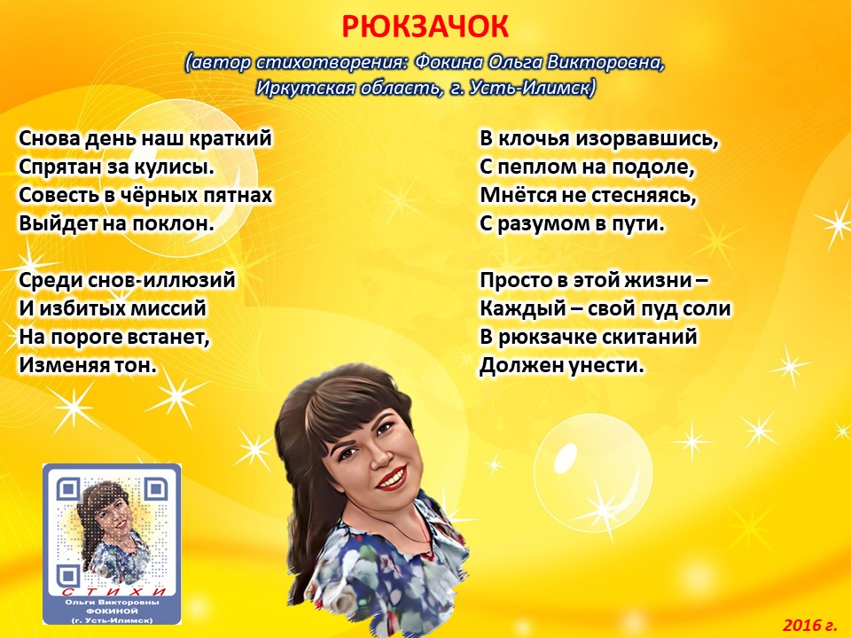 Читает автор стихотворения: ФОКИНА ОЛЬГА ВИКТОРОВНА (Иркутская область, город Усть-Илимск) СТИХИ: https://stihi.ru/2018/07/08/3790 БИОГРАФИЯ: http://www.proza.ru/2019/10/08/1473 ВЫИГРЫВАЙТЕ КНИГИ БЕСПЛАТНО: https://proza.ru/2017/09/17/447 ОТЗЫВЫ ЧИТАТЕЛЕЙ: http://www.proza.ru/2019/11/29/611 Из книги Фокиной Ольги Викторовны (Усть-Илимск) «Несу добро в ладошках!»: [все стихотворения с 2005 по октябрь 2020 гг., проза, авторские песни, интервью]. – Москва: МГО Союза писателей России, 2020 г. – 886 стр., ил. ISBN 978-5-7949-0826-8 РЮКЗАЧОК (автор стихотворения: Фокина Ольга Викторовна, Иркутская область, г. Усть-Илимск) Снова день наш краткий Спрятан за кулисы. Совесть в чёрных пятнах Выйдет на поклон. Среди снов-иллюзий И избитых миссий На пороге встанет, Изменяя тон. В клочья изорвавшись, С пеплом на подоле, Мнётся не стесняясь, С разумом в пути. Просто в этой жизни – Каждый – свой пуд соли В рюкзачке скитаний Должен унести. 31 октября 2016 г.