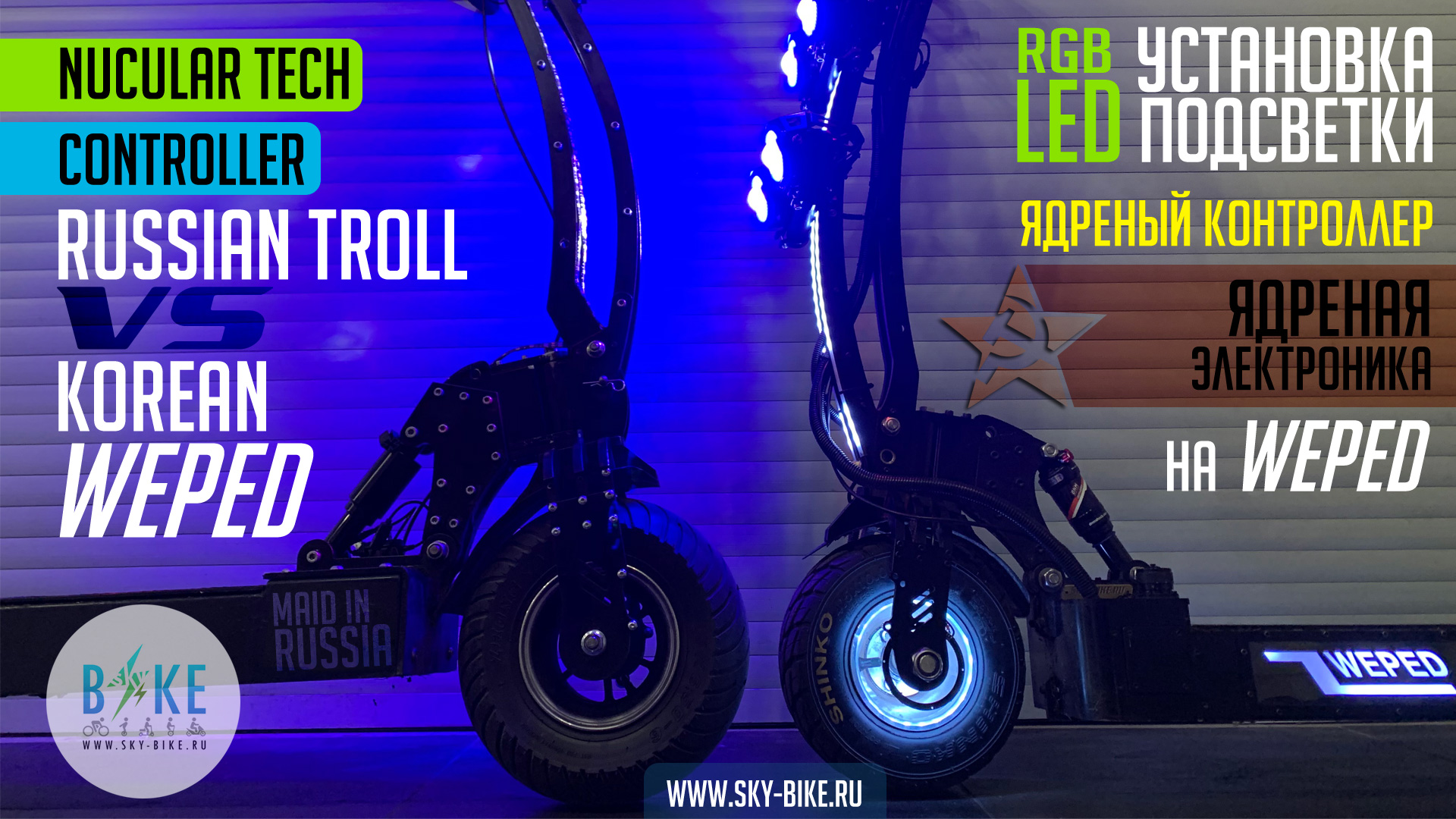 Подключение оптики, LED подсветки рулевой, колес и логотипа, а так же ставим ядреный контроллер на электросамокат WEPED. Сравниваем корейский WEPED и российский электросамокат Тролль. На что способен отечественный самокат с ядреной электроникой внутри? / Nucular Electronics Controller - 12F, 250A фазный и 150A батарейный ток в сочетании с мотор колесом от DUALTRON X