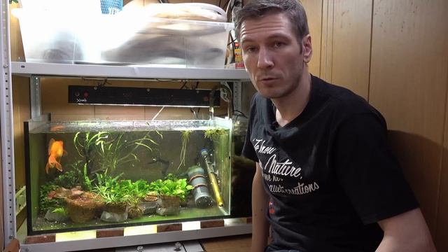 Этот аквариум я не показывал около года. За это время он пережил цветение воды, нитчатые и сине-зеленые водоросли. Сейчас там живёт золотая рыбка и избыток растений из кубика и острова