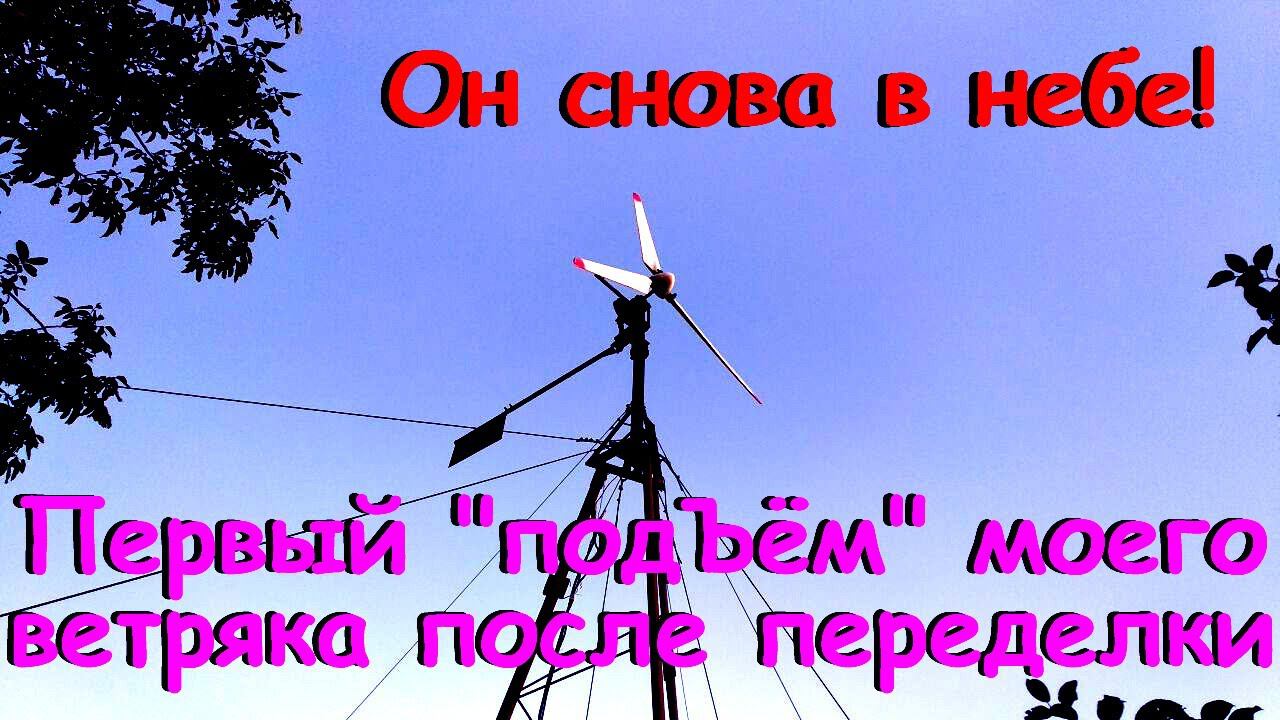 Наконец, спустя более пол года, мой ветряк снова поднялся в небо. Ременной привод был заменён сплошным валом, переделано крепление и т.д. Что выдаёт, пока не знаю - ветра нет.
