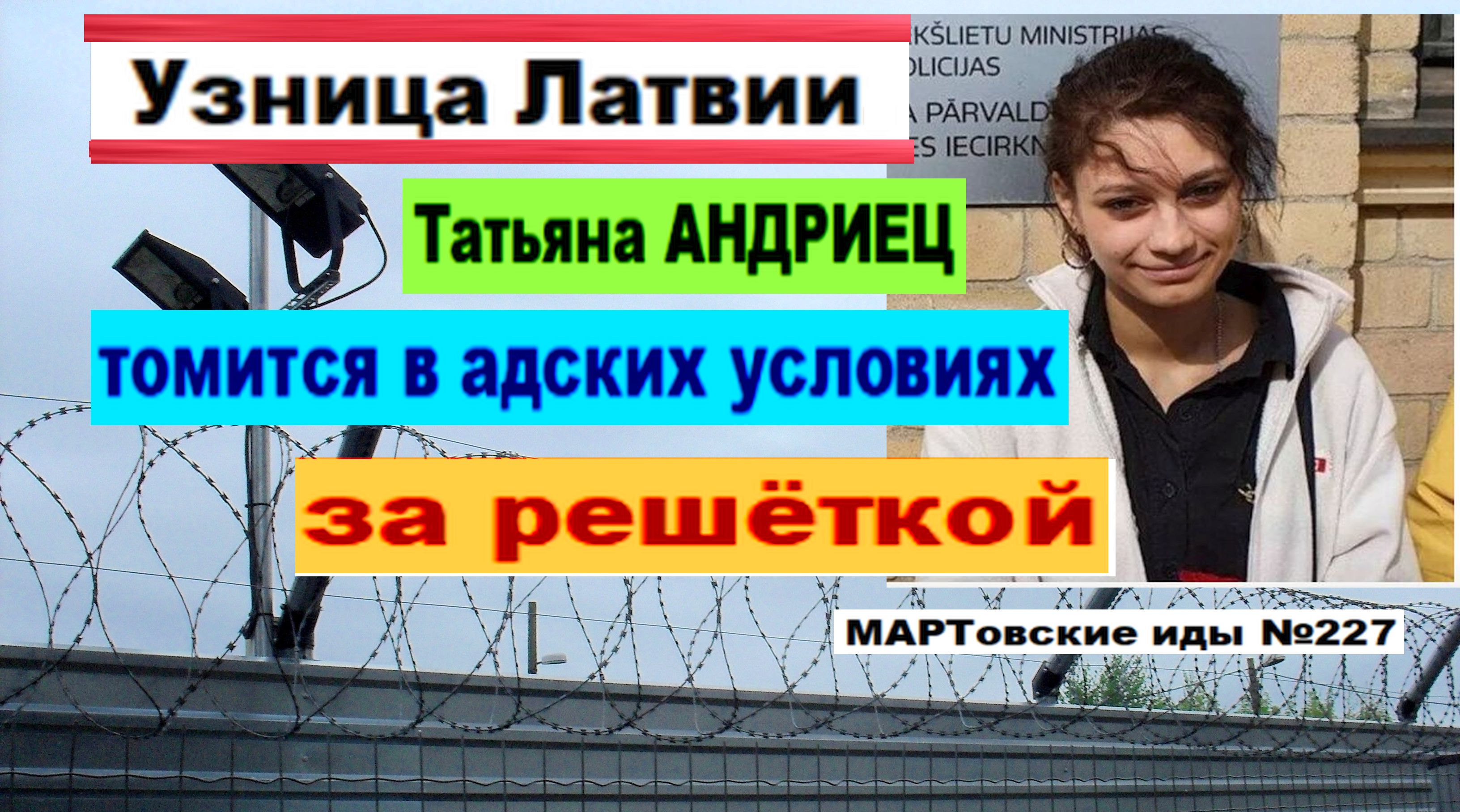 "Узница Латвии. Татьяна АНДРИЕЦ томится в адских условиях за решёткой". 8 февраля 2023 года Рижский городской суд поместил Татьяну Андриец под арест, и с тех пор эта мера пресечения не менялась. В уголовном процессе, начатом 28 ноября 2022 года, активистка подозревалась в действиях, направленных против Латвии, путем развертывания систематической пропаганды и мер воздействия в коммуникационном приложении. Арестованная активистка в своем письме рассказала о тяжелых условиях содержания в рижской тюрьмы. "У подследственных самые суровые условия. Они сидят круглосуточно в изоляторе, имеют право только на один звонок в неделю — по пять минут, одно свидание в месяц — только с прямыми родственниками, хотя они есть не у всех. Подследственные не могут ходить на работу, кружки или в библиотеку. Они гуляют в небольшом вольере-клетке", — написала Татьяна Андриец. Она отметила, что со стороны защиты прав людей это выглядит нелогично, поскольку пока нет приговора, человек невиновен. Такова тема сегодняшнего выпуска новостей "МАРТовские иды №227". Ждём комментарии! См. видео: