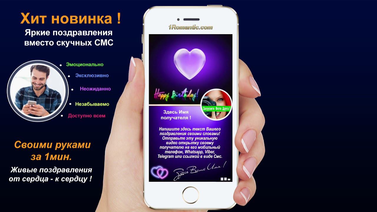 ЗАПОЛНИТЬ ЭТУ ОТКРЫТКУ СЕЙЧАС: https://1romantic.com/musicalnye-pozdravleniya/ot-serdtsa/ Дорогие друзья! Вам остаётся только, написать нужный вам текст и загрузить свою фотографию. 1Romantic.com Является первым и единственным в мире сервисом интерактивных видео поздравлений. Мы используем собственную уникальную технологию, добавляя ежедневно самые новые и последние разработки программирования. У нас Вы можете найти поздравления на любой вкус, только высокого качества и разрешения. Согласитесь, всегда приятней, отправить поздравления от себя лично, чем пересылать чужие, с уже заготовленным стандартным и быстро мерцающим текстом, как рекламный баннер, пересылаемый друг-другу от тысячи к тысячам где нет Ваших Имён. Задумайтесь ! Это выглядит слишком наивно и как минимум глупо, особенно для людей которые умеют писать и читать (на мою розочку сверкалку или стикер и отвали). Теперь всё будет иначе ! Вы можете сами передать своё настроение, тем людям, которым Вы будете адресовать своё поздравление. Теперь Вы сами, творец, художник и поэт своих чувств, наполняя видео открытку своими словами, излучая только самое доброе, искреннее из своих тёплых сердец. Загрузить свою любимую фотографию или фотографию получателя, что безусловно, будет гораздо приятней и неожиданней для него) Безусловно, мы подумали и о музыкальном оформление. Наверняка, Вы будете подбирать нужные слова и фотографию под ту песню, которую Вы захотите загрузить сами, а не ту которую Вам навязывают. Ну и самое главное, Вы можете использовать функцию добавления своего голоса, программа сама наложит Ваш голос на начало загруженной песни. Поверьте это очень оригинально, особенно если Ваш друг не слышал Вас долгие годы. Такое поздравление можно сделать действительно за 30-60 сек. Но если Вы творческий человек, оно не отпустит Вас так быстро))) И Вы будете думать, сочинять, плакать, улыбаться, восхищаться, раскрыв в себе новые таланты... возможно это станет Вашим первым собственноручным творением . Удачи Вам ! С уважением, Ваши Романтики ! Краткий список предлагаемых нами поздравлений... Поздравления с днем рождения женщине. Поздравления с днем рождения мужчине. Поздравления с днем рождения другу. Поздравления с днем рождения подруге. Поздравления с днем рождения для детей. Поздравления с днем святого Валентина. Поздравления Папе. Поздравления с днем рождения Маме. Прикольные поздравления. Видео поздравления с днем рождения. Музыкальные поздравления с днем рождения. Слайд-шоу с днем рождения. и многое-многое другое.