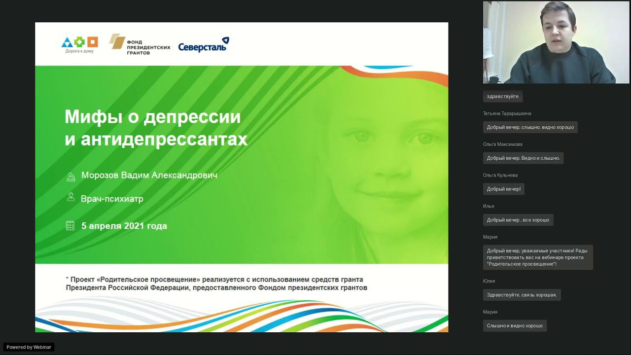 Запись вебинара о том, в каких случаях антидепрессанты могут помочь вашему ребенку, какие особенности необходимо учитывать при приеме антидепрессантов и другое. Врач-психиатр Морозов Вадим Александрович, специалист проекта «Выбери жизнь» БФ «Дорога к дому», рассказал также о депрессии у подростков и приеме ими антидепрессантов. Справка: проект «Родительское просвещение» Благотворительного фонда «Дорога к дому» компании «Северсталь» реализуется с использованием гранта Президента РФ на развитие гражданского общества, предоставленного Фондом президентских грантов.