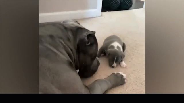 Взрослый пёс гладит щенка по голове лапай