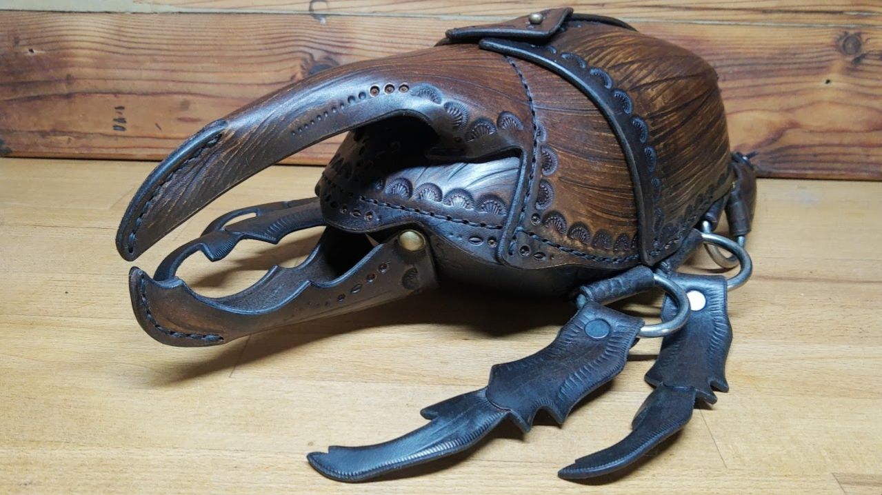 В видео автор поэтапно демонстрирует процесс создания кожаного изделия в форме жука: 00:12 — Работа с кожей. Начинается с подготовки материала — качественной кожи растительного дубления. 01:09 — Тиснение. Автор выполняет декоративную обработку поверхности кожи с помощью специальных инструментов. 01:36 — Окрашивание. Производится окрашивание отдельных элементов для придания изделию нужного оттенка. 02:27 — Формовка. Автор придаёт деталям необходимую форму, прорабатывая объёмные элементы изделия. 03:20 — Шитьё. Выполняется сшивание подготовленных деталей — мастер показывает технику соединения элементов. 05:48 — Соединение брюшка и верхней части. Автор аккуратно совмещает и закрепляет основные конструктивные элементы изделия. 06:34 — Изготовление крыльев. Создаются и монтируются крылья — важная декоративная и конструктивная часть изделия в форме жука. 08:31 — Демонстрация готового изделия. В финале автор представляет завершённое изделие, показывая его со всех ракурсов и подчёркивая детали работы. Уровень сложности: средний. Необходимый набор инструментов: базовый. Рекомендуемые материалы кожа растительного дубления толщиной 2,7 мм (7 унций); 6 D‑образных колец для ремней шириной 3,2 см (1¼ дюйма); 1 кнопочный замок (нажимная кнопка); 1 заклёпка типа Sam Brown Head для застёжки; 2 заклёпки с полукруглой головкой. Необходимые инструменты триммер для обработки краёв; режущий нож; полировальный инструмент (бурниш); пробойник для отверстий; костяной сгибщик (bone folder); зажимы; материалы для шитья; долото ромбовидной формы; заклёпки; наковальня.