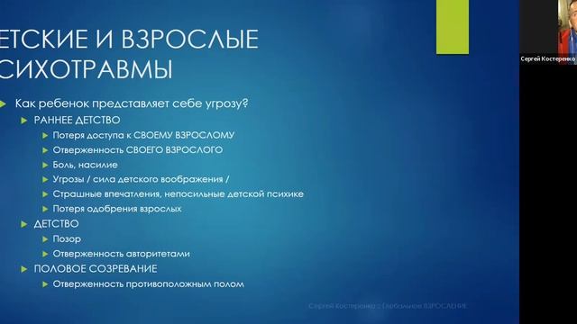 Все мы родом из детства.. Слышали? Как детство влияет на взрослую жизнь? Давайте разберёмся вместе! - Как ребёнок может получить травму, которая станет влиять на его жизнь? - В чем важные отличия детского восприятия от взрослого? - Какие 3 типа психотравм бывают? - Как с ними справляться? И наконец, - Как уберечь своих детей от психотравм, не испортить им жизнь? Живые ответы на Ваши вопросы! ♂️ ⚜️Встреча прошла в ZOOM⚜️ Суббота 18.12.21 В 18:00 мск ✅ Присоединяйтесь! ✅ Приглашайте друзей! Анонсы новых встреч и полезные практики в Телеграмм-чате: ✔️ ТЕЛЕГРАМ: https://t.me/sergey_kosterenko ✔️INSTAGRAM: https://www.instagram.com/kosterenko.sergey #сергейкостеренко #взросление #счастье #глобальноевзросление #эмоции #воспитание #коуч #коучинг #психолог #психология #радость #любовьксебе #воспитаниедетей #родители #дети #психотравма #детскиетравмы