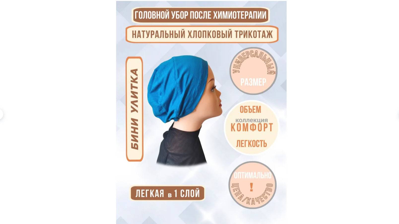 https://www.ozon.ru/product/golovnoy-ubor-posle-himioterapii-bini-ulitka-hb-trikotazh-1639483223/ Бини универсального размера подойдет на любую стандартную женскую голову в пределах размеров 55-58. Довольно объемный лёгкий головной убор после химиотерапии из натурального качественного хб трикотажа в 1 слой, фасон Бини «Улитка» оригинального неизбитого кроя с небольшим “навесом” сзади. Мягкий тонкий трикотаж обеспечивает коже комфорт и деликатную защиту, а уверенное прилегание шапочки по линии роста волос достигается встроенной сзади на шее резинкой. Чтобы образ смотрелся гармонично, носите шапочку Бини в комбинации с совпадающими по цвету и стилю элементами одежды или аксессуарами. Головной убор после химиотерапии на теплое время года послужит отличной заменой парику! Продуманная модель и приятная расцветка позволят Вам чувствовать себя удобно. Шапочка после химиотерапии лёгкая, не жаркая, поэтому в ней комфортно пребывание и на улице в теплое время года, и дома, и в медучреждении. Так как шапочка Бини сшита цельным головным убором, она легко надевается как обычная шапка, не требуя дополнительных усилий, и мгновенно преображает Ваш образ! Головной убор после химиотерапии Бини «Улитка» универсального размера и подойдет на любую стандартную женскую голову в пределах размеров головы 55-58. Универсальность достигается за счет достаточно объемного кроя и вставленной на шее мягкой резинки, обеспечивающей комфортное прилегание шапочки по размеру головы. Для шапочки Бини после химиотерапии из хб трикотажа рекомендована ручная стирка. Шапочка легко стирается и быстро сохнет, позволяя поддерживать гигиену кожи головы без лишних хлопот. В «двух словах» стирать шапочку Бини нужно вручную в теплой воде без замачивания с добавлением стирального порошка для ручной стирки. Рекомендуем сушить Бини на горизонтальной поверхности, гладить не нужно.