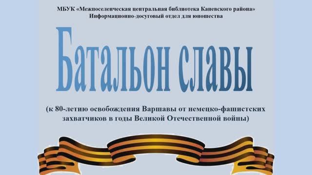 С 12 января 1945 года проводилась Висло-Одерская наступательная операция. Ее важной частью стала Варшавско-Познанская операция по освобождению столицы Польши Варшавы. Она началась 14 января и в этот день бойцы и командиры 1-го батальона 215-го полка 77-й гвардейской стрелковой дивизии 1-го Белорусского фронта совершили небывалый подвиг, за который подразделение получило почетное наименование — «Батальон Славы» Зав. информационно-досуговым отделом для юношества Т.Н. Малахова