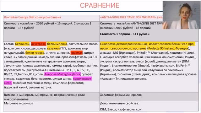 Сравнение составов Anti-Aging Diet TaVie и Гербалайф (Herbalife) Формула 1 (вечерний), Банановый коктейль Energy Diet (NL), Balancer «Фисташковый мусс» от GreenWay 0:00 – Доктор эндокринолог-диетолог, врач с интегративным подходом 01:32 – Цель сравнения – состав – белковое, функциональное, безопасное питание 03:01 – Сравнение коктейлей: Гербалайф (Herbalife) Формула 1 (вечерний) и Ночного коктейля Anti-Aging Diet TaVie Night 04:29 – Сравнение цены 05:10 – Сравнение ценности – 05:10 - состав Формула 1; 05:28 – состав TaVie Night; 05:38 – сравнение белка; 07:22 – калорийность, белки, жиры и углеводы; 08:57 пищевые волокна 09:23 – Состав коктейля Гербалайф (Herbalife) Формула 1 (вечерний) с упаковки – 10:50 – мальтодекстрин; 14:36 – витаминно-минеральный комплекс (премикс), состав, форма, биодоступность; 19:40 – стабилизаторы, консерванты, печенье; 21:18 – глютен; 23:16 – пищевые волокна; 24:52 – калорийность (снижение веса); 25:47 – вывод о функциональности и безопасности; 27:19 – масло канолы (рапсовое); 18:36 - Состав коктейля Anti-Aging Diet TaVie Night – 22:15 – фитолин (Phytolin); 26:44 – витамины и микроэлементы 27:42 – Синтез серотонина. L-Tryptophan (триптофан), 5-HTP, серотонин. Мелатонин. Сахар и инсулинорезистентность 34:05 – Коктейли Energy Diet (NL) в сравнении с Женским коктейлем Anti-Aging Diet TaVie for Woman. 35:06 – сбалансированное питание, либо белковое 36:09 – Банановый коктейль Energy Diet и Женский коктейль Anti-Aging Diet TaVie – 36:29 – стоимость порции коктейля; 37:06 – состав: белки; 37:54 – декстроза; 40:53 – фитолин; 41:18 – выводы о составе бананового коктейля (по белкам и углеводам); 41:45 – казеинат; 43:23 – крахмал; 44:16 – витамины; 44:38 – ацерола (противопоказания); 47:49 – польза и вред жиров и масел; 49:56 – королевское желе 53:27 – Функциональность коктейлей Energy Diet (NL) и Anti-Aging Diet TaVie for Woman – 54:07 – DIM; 54:36 – эквол 55:26 – Пищевые консерванты в составе (ортофосфат кальция Е341, ортофосфат калия Е340, камедь тары Е417) 56:42 – Коктейль Balancer «Фисташковый мусс» от GreenWay и Anti-Aging Diet TaVie for Woman в сравнении – 56:56 – стоимость порции; 57:08 – составы: 1:00:59 – паллатиноза (изомальтулоза), 1:02:50 – волокна, 1:03:04 – витамины и минералы, 1:04:44 – консерванты, 1:05:02 – антиоксиданты. 1:06:07 – выводы о составе 1:07:24 – преимущества коктейлей Anti-Aging Diet TaVie 1:12:13 – Ответы на вопросы: 1:12:13 – Как долго можно пить женский коктейль? 1:13:29 – По истечении срока годности можно пить коктейль? 1:13:48 – Девочке 14 л, сахарный диабет 1-го типа, тиреоидит можно ли пить женский коктейль? 1:14:14 – Можно ли ночной коктейль детям от 2-х лет? 1:15:21 – При молочнице можно пить женский коктейль? 1:16:08 – После коктейлей просыпается аппетит… 1:17:20 – Нехватка железа, какой коктейль может лучше подойти девушке? 1:18:09 – До какого возраста можно пить женский коктейль? 1:18:40 – После инфаркта мужчине можно пить мужской коктейль? 1:19:01 – Девочке 12 л, есть лишний вес что использовать? 1:19:35 – Можно разводить коктейль горячей водой? 1:20:14 – У мужчины при употреблении муж