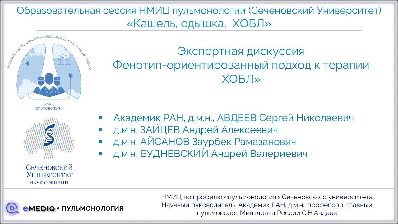 eMediQ • Пульмонология | Дискуссия «Фенотип-ориентированный подход к терапии ХОБЛ» в рамках Образовательной сессии «Кашель, одышка, ХОБЛ» НМИЦ Пульмонологии Сеченовского университета, 25 апреля 2023г. ВНИМАНИЕ! Данный материал предназначен только для действующих специалистов здравоохранения! © С.Н.Авдеев, А.А.Зайцев, З.Р.Айсанов, А.В.Будневский, НМИЦ Пульмонологии Сеченовского университета, eMediQ Программа: 1. Основные генотипы ХОБЛ (З.Р.Айсанов) 2. Кому показаны муколитики при ХОБЛ (А.В.Будневский) 3. Кашель и муколитики (А.А.Зайцев) 4. ХОБЛ: место мукоактивных препаратов (С.Н.Авдеев) 6. Обсуждение, ответы на вопросы. Наш канал в YouTube: youtube.com/emediq Telegram-канал НМИЦ Пульмонологии Сеченовского университета - мероприятия, анонсы, научные данные и исследования https://t.me/NMRC_pulmo Подписывайтесь на Telegram-канал для анестезиологов-реаниматологов "Телеграмма РИТЕ" - отвечаем на Ваши вопросы и проводим опросы по темам школ https://t.me/rita_resp Регистрируйтесь на образовательной платформе https://emediq.ru Подробная информация о НМИЦ Пульмонологии Сеченовского университета на официальном сайте https://pulmo-nmic.ru/