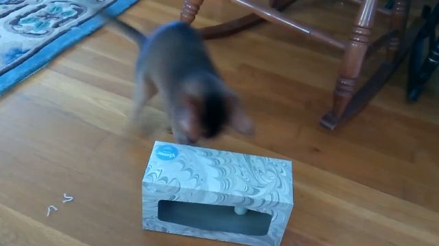 Mom recently bought an Abyssinian kitten, and named her Cleo (after Cleopatra). To cure Cleo of her habit of pulling all the tissues out of the box and shredding them, Mom took the tissues out, and replaced them with Cleo's Mr. Penguin toy (one of those plastic roly-poly toys that doesn't fall down). Cleo decides to go "fishing" for her Mr. Penguin toy in the tissue box. She has so much fun that Hermana, Mom's older Abbysinian, has to join in.